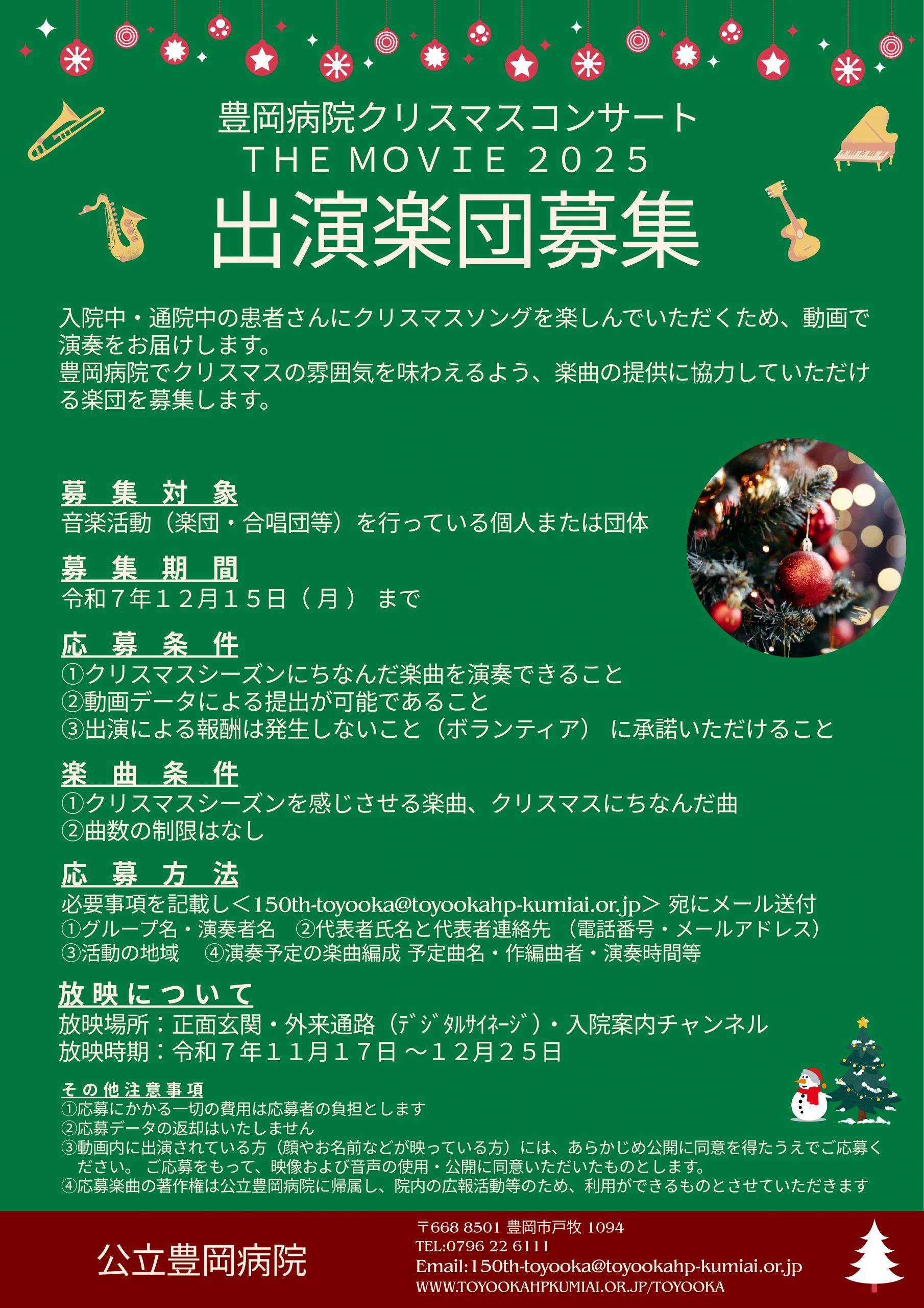豊岡病院では、入院中・通院中の患者さんに少しでもクリスマスの雰囲気を味わっていただけるよう、クリスマスコンサートを動画形式で開催することになりました。