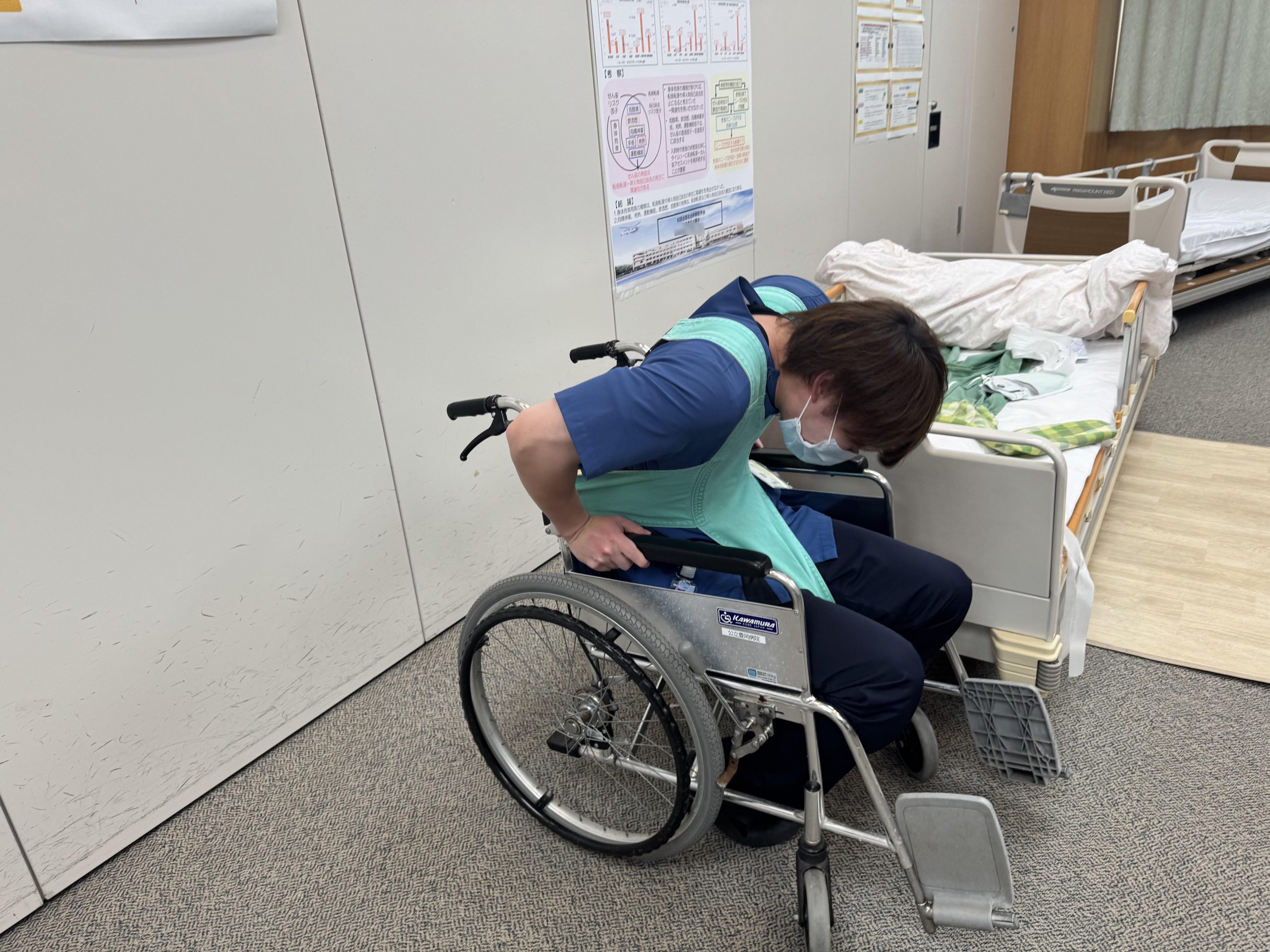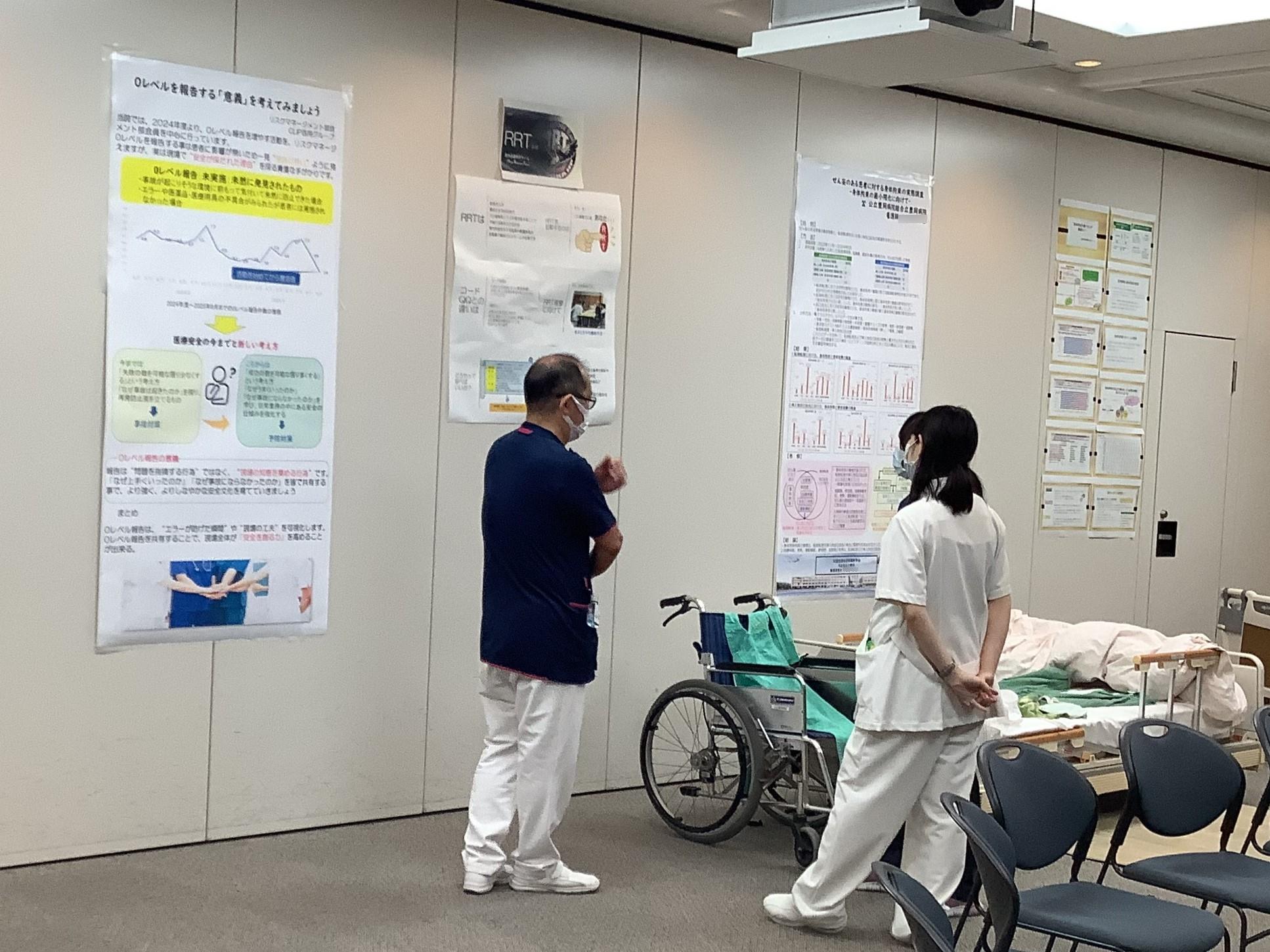 医療安全ブースでは、医療安全に関するポスター展示、ヒヤリハットに関する職員出演のビデオ上映、身体拘束の体験コーナーを設置しました。