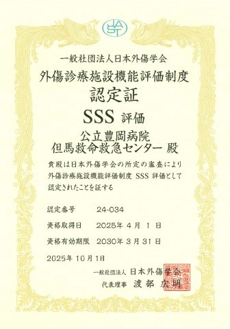 このたび、当院の救命救急センターは、一般社団法人 日本外傷学会が実施する「外傷診療施設機能評価制度」において、最上位評価である「SSS評価」を受けました。