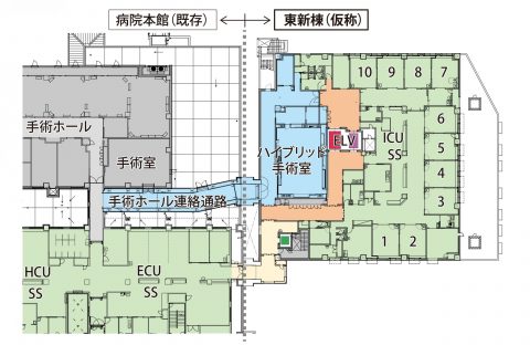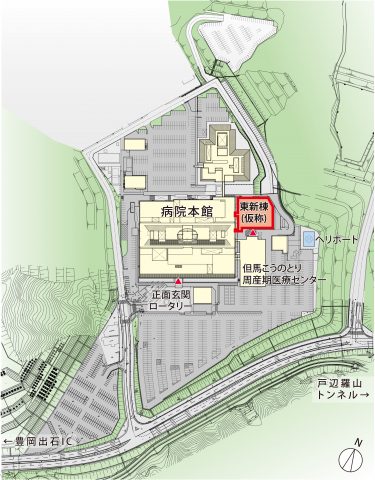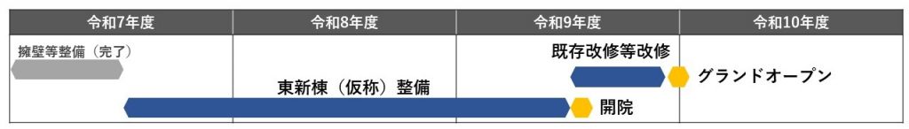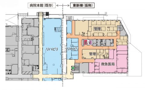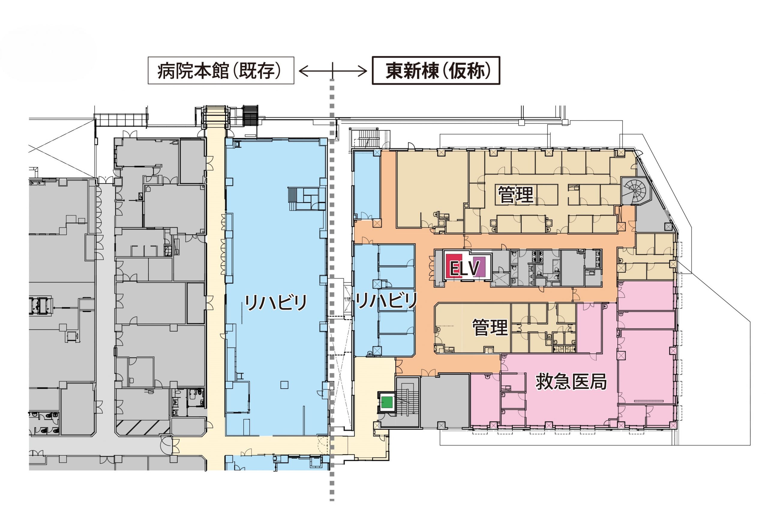 本事業において、地域の人々の安全と安心を守るため、高度かつ最適な医療提供の継続に向けて、東新棟(仮称)を建設し既存本館と一体的に再整備を行います。