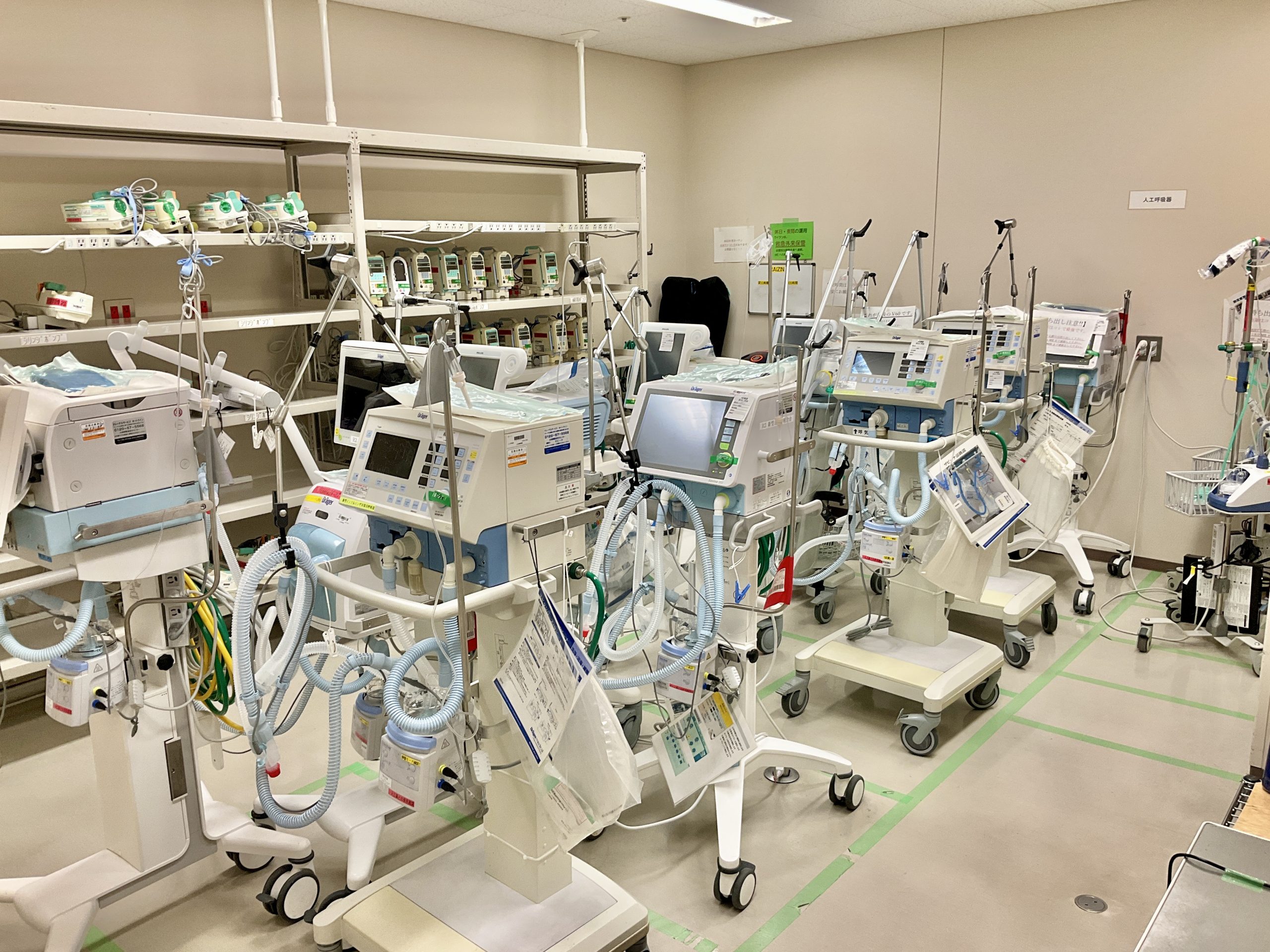 当院ME室では人工呼吸器といった生命維持管理装置から、輸液ポンプやシリンジポンプ等、院内で使用されるさまざまな医療機器を安全に使用できるように、また機器の性能が維持できるように保守・点検を行います。人工呼吸器に関しては、患者様に使用中の時は、1日に1回動作状況が問題ないか、病室に行き点検しています。患者様に使用後はME室にてチェックを行い、次の患者様に安全に使用できるようにしています。